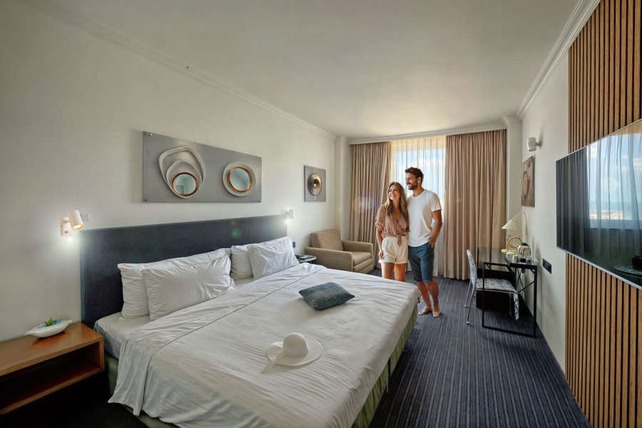 The Grand Beach Hotel in Tel Aviv hinges on highlighting its unique blend of European style, Israeli hospitality, and prime location. With 212 newly renovated rooms, the hotel caters to both leisure and business travelers, offering a range of amenities designed for comfort and convenience. Key features include: Prime Location: Situated in the heart of Tel Aviv, the hotel is just a 5-minute walk from the beach and within close proximity to the city's best dining, shopping, and cultural venues. Its location near major transportation hubs and airports makes it easily accessible for travelers. Accommodations: All rooms are newly renovated or new, featuring unique fittings, a mini-fridge, dry cleaning services, electronic door locks, and an ironing room on each floor. Special services such as doctor-on-call are also available, ensuring a comfortable and worry-free stay. Dining and Leisure: The hotel boasts first-class food and beverage services, including a lobby bar set in a welcoming atmosphere. The rooftop swimming pool, open during the summer season, offers stunning city and beach views, complemented by a special sunbathing deck. Business Facilities: Grand Beach Tel Aviv is equipped with modern conference halls and meeting rooms, named "Kinnerat" and "Yam Tikhon," featuring state-of-the-art technological equipment. Business travelers also benefit from complimentary access to a 24/7 shared work lounge, equipped with workstations, seating areas, and light refreshments. Accessibility and Parking: While the swimming pool is not wheelchair accessible, the hotel ensures convenience with nearby public parking (for a fee), catering to guests who arrive by car. Exceptional Service: Above all, the professional and friendly staff at Grand Beach Tel Aviv are dedicated to providing a warm, personal greeting and ensuring that every stay is unforgettable. A blend of location, luxury, and personalized service.