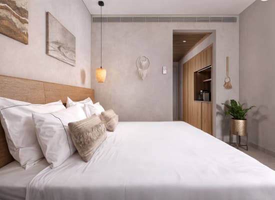 חדר גן פונה לבריכה מציע גינה פרטית של 16.5 מ"ר וחדר מפנק של 29 מ"ר המארח בנוחות של זוג + 2 או 3 מבוגרים. בחדר מיטת קווין סייז מפנקת או שתי מיטות יחיד, מצעים איכותיים מכותנה מצרית, פינת עבודה וחדר רחצה פרטי עם מקלחון מפל מים ומוצרי אמבטיה מפנקים.