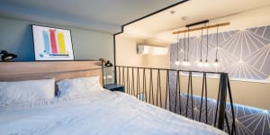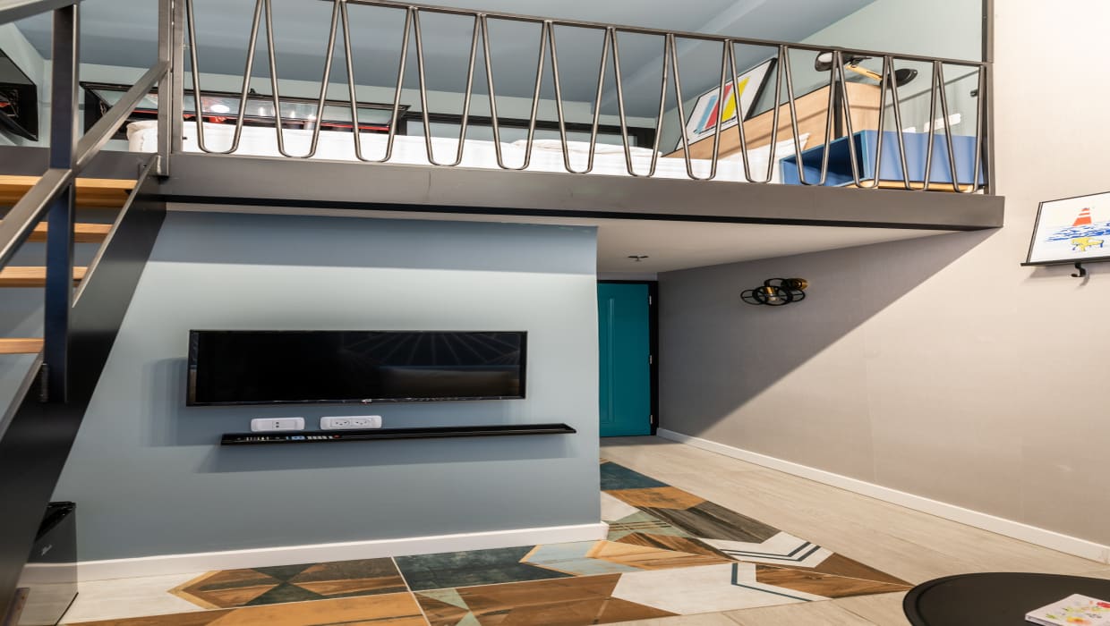 מיטה זוגית ממוקמת בגלריה, ספה נפת חת ממומקת בקומת הקרקע